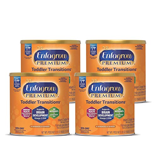 Enfagrow PREMIUM Toddler Transitions Nutritional Drink, (9-18 Months) Vanilla Flavor, Omega-3 DHA for Brain Support, Prebiotics & Vitamins for Immune Health, Non-GMO, Powder Can, 20 Oz, Pack of 4