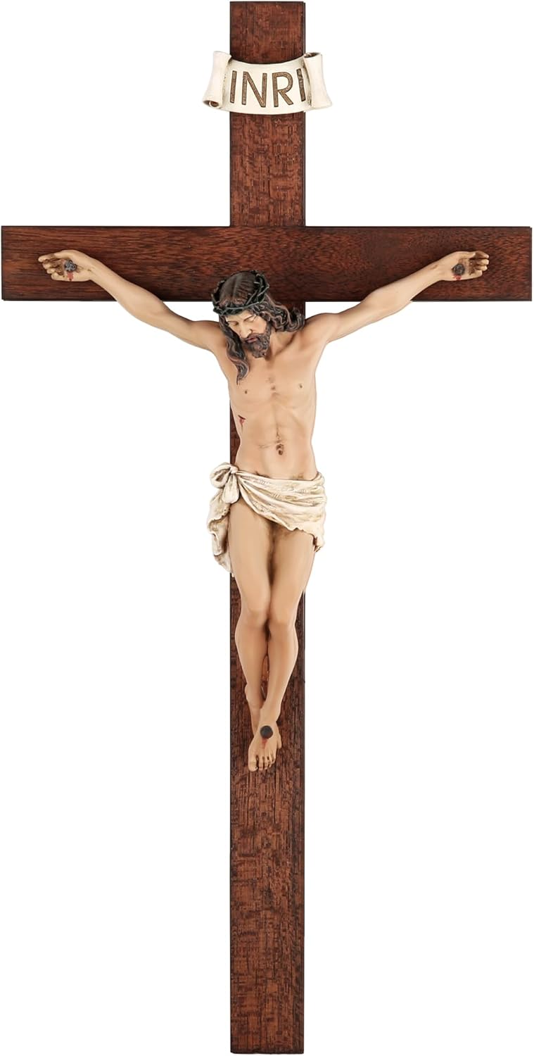 Crucifix Wall Cross - 14 Inch Olive Wood Wall Crucifix, Hand Painted Resin Jesus on Wooden Crucifix Catholic Home Decor Housewarming Religious Gifts