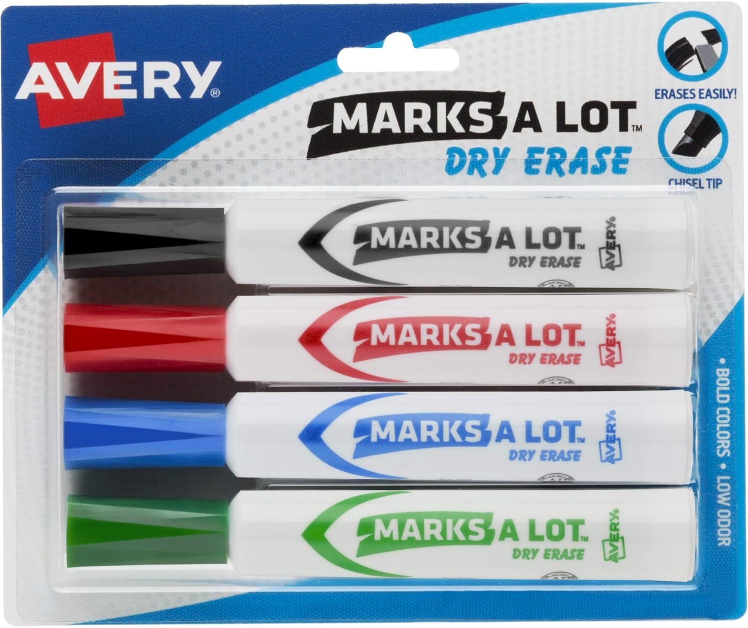 Avery Marks-A-Lot Dry Erase Markers, Assorted Colors (1 Black, 1 Blue, 1 Green, 1 Red) Pack 4 (24409)