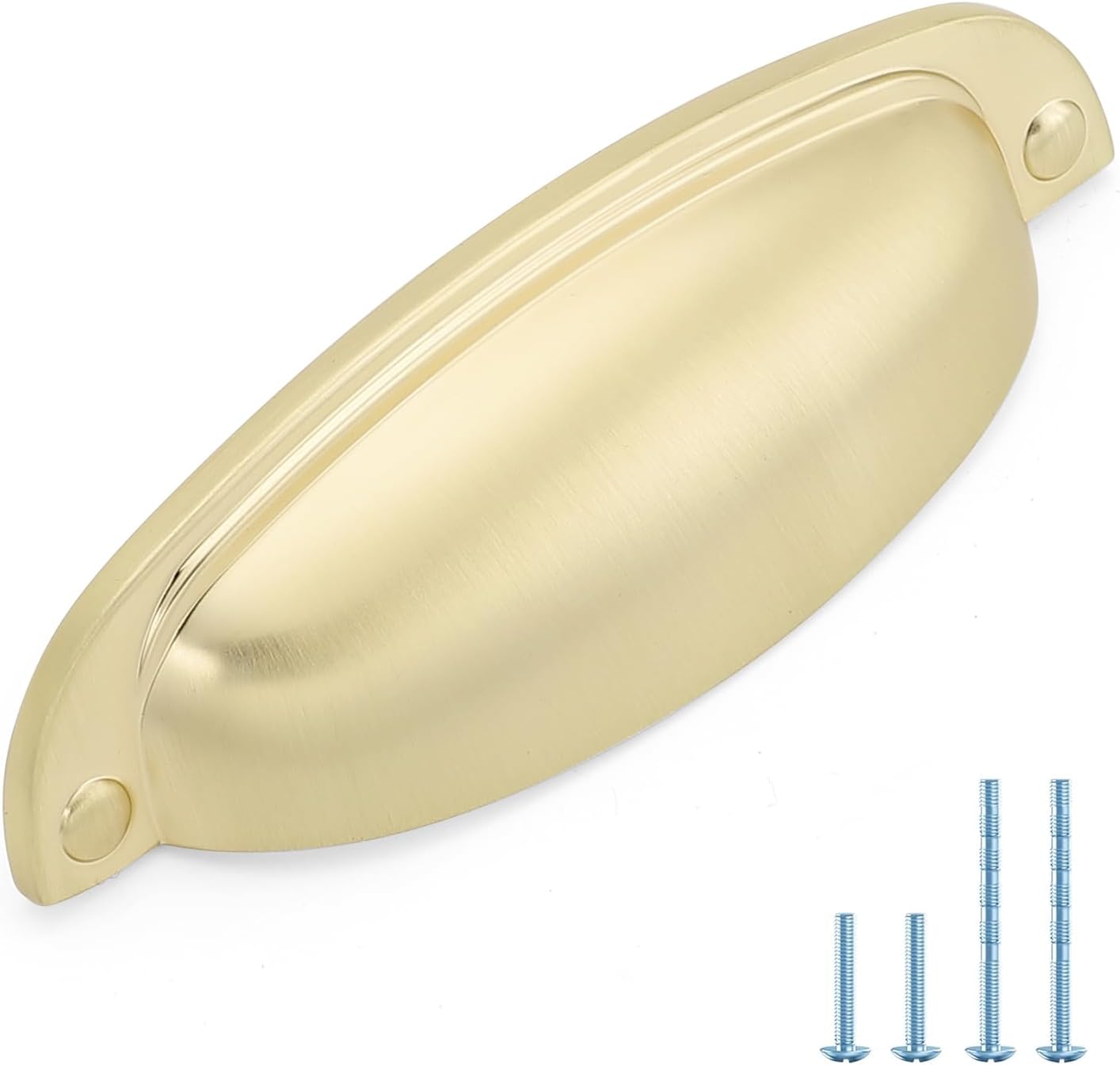 JOY DECOR 5 Pack 3-3/4" Drawer Pulls Brushed Brass Cabinet Pulls Drawer Handles Gold Drawer Pulls Kitchen Hardware Cabinet Cup Pulls for Drawers Dressers Hardware Handles Farmoushe Cabinet Handles