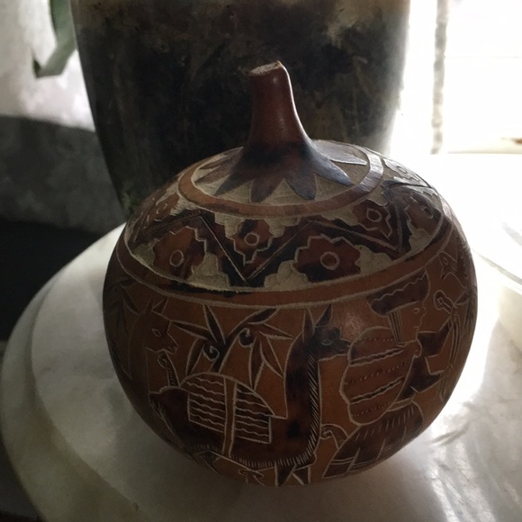 Vintage handmade gourd container and Carved wooden Fish