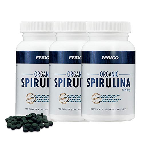 FEBICO Organic Spirulina Tablets - 500mg x 180 tablets/bottle, set of 3 bottles, 90 days supply, Enriched B12, Non-GMO, Gluten-Free