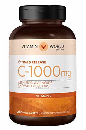 Vitamin World Vitamin C 1000 mg. Timed Release 250 Caplets, Bioflavonoids, Wild Rose Hips, Vegetarian, Gluten Free